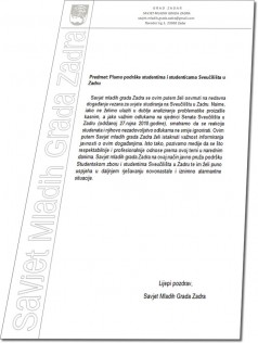 “Savjet mladih grada Zadra se ovim putem želi osvrnuti na nedavna događanja vezana za uvjete studiranja na Sveučilištu u Zadru. Naime, iako ne želimo ulaziti u dublje analiziranje problematike proizašle kasnim, a jako važnim odlukama na sjednici Senata Sveučilišta u Zadru (održanoj 27. rujna 2010. godine), smatramo da se reakcija studenata i njihovo nezadovoljstvo odlukama ne smije ignorirati. Ovim putem Savjet mladih grada Zadra želi istaknuti važnost informiranja javnosti o ovim događanjima. Isto tako, pozivamo medije da se što respektabilnije i profesionalnije odnose prema ovoj temi u narednim danima. Savjet mladih grada Zadra na ovaj način javno pruža podršku Studentskom zboru i studentima Sveučilišta u Zadru te im želi puno uspjeha u daljnjem rješavanju novonastale i iznimno alarmantne situacije.”