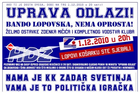 – Dokažimo da nas još uvijek ima i da se želimo boriti protiv lopova i političkih igara. KK Zadar je na rubu ponora, ali nemojmo dopustiti da naša svetinja propadne u provaliju. Zato pozivamo sve Zadrane i one kojima je KK Zadar u srcu da se u srijedu 1. prosinca okupe na Narodnom trgu u 20 sati, te da na miran način pokažemo gradskom HDZ-u koje je Klub doveo tu gdje je sada što mislimo o tome.