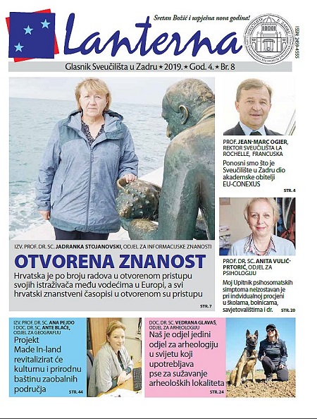Izašao je osmi broj Lanterne, Glasnika Sveučilišta u Zadru, u kojemu se obrađuju teme iz sveučilišnog života. Uz prikaz redovitih događanja Lanterna donosi intervjue s prof. Jean-Marc Ogierom, rektorom Sveučilišta La Rochelle, partnerom zadarskog sveučilišta u mreži EU-CONEXUS, prof. dr. sc. Anitom Vulić-Prtorić s Odjela za psihologiju, izv. prof. dr. sc. Jadrankom Stojanovski s Odjela za informacijske znanosti, prof. dr. sc. Iris Tićac s Odjela za filozofiju… U uvodnim stranicama prenosi se govor rektorice prof. dr. sc. Dijane Vican studentima prilikom početka akademske godine, u kojemu ih je upoznala s konzorcijem EU CONEXUS, preko kojeg studenti i profesori imaju osigurane “mogućnosti razmjene znanja i iskustava u mijenjajućem licu tržišta rada te suradnje u različitostima”.