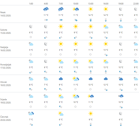 Danas u početku u većini krajeva pretežno oblačno s povremenom kišom, uglavnom na Jadranu ponegdje i pljuskovima s grmljavinom. U najvišim predjelima kiša može prijeći u susnježicu i snijeg. Već tijekom jutra sa zapada postupni prestanak oborine, zatim i razvedravanje, a oblačnije s mjestimičnom kišom poslijepodne će još biti na krajnjem istoku i jugu. Umjeren jugozapadnjak, u gorju i na sjevernom Jadranu moguće jak, u Dalmaciji i jugo, okretat će na sjeverozapadnjak i sjeverac. Na moru prema večeri i bura, mjestimice jaka s olujnim udarima. Najviša temperatura zraka uglavnom između 10 i 15 °C.