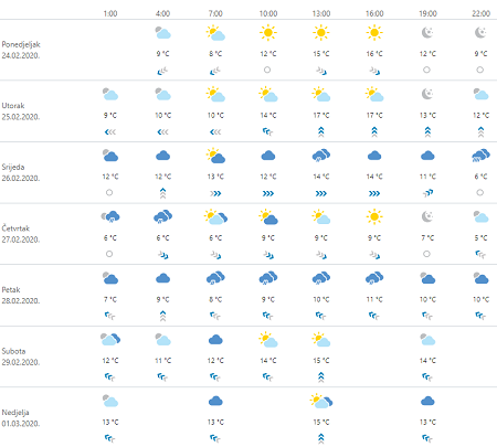 U utorak na sjevernom Jadranu i u Gorskom kotaru umjereno do pretežno oblačno, povremeno uz kišu. Drugdje još ujutro pretežno sunčano, potom porast naoblake sa zapada uz malu vjerojatnost za mjestimičnu slabu kišu, prvenstveno u Dalmaciji. U unutrašnjosti te na sjevernom Jadranu će puhati umjeren i jak jugozapadnjak, osobito u gorju s olujnim udarima, a u Dalmaciji umjereno i jako jugo. Najniža temperatura zraka na kopnu do 1 do 5, između 9 i 12 na moru, a najviša između 14 i 18, na sjevernom Jadranu i u gorju oko 10 °C.