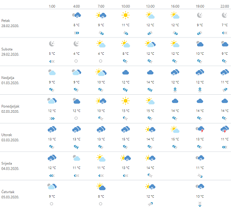 U početku djelomice sunčano, a od nedjelje oblačnije s povremenom kišom. U subotu i ponedjeljak će na kopnu puhati umjeren jugozapadnjak, na udare i jak, a u nedjelju vjetar većinom slab. Na Jadranu za vikend umjereno i jako jugo, u ponedjeljak će malo oslabjeti. Temperatura zraka u porastu, osobito jutarnja.