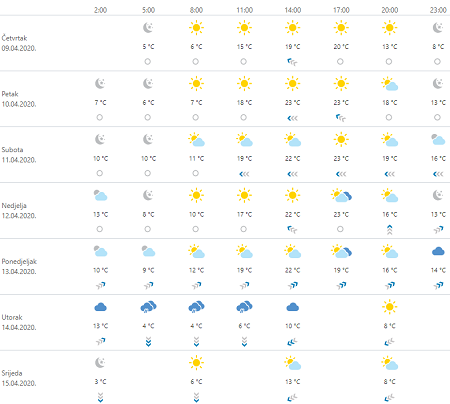 Prevladavat će sunčano, u unutrašnjosti mjestimice s malom i umjerenom naoblakom, a u gorju uz malu mogućnost za lokalni pljusak. Vjetar na kopnu slab do umjeren, u petak sjeveroistočni, u nedjelju južni i jugoistočni. Na Jadranu ujutro slaba do umjerena bura, danju jugozapadni vjetar, prema otvorenom moru i sjeverozapadni. Jutra u unutrašnjosti razmjerno svježa, a danju posvuda toplo.