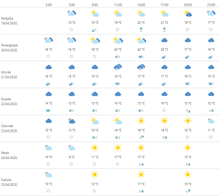 Danas veći dio dana pretežno sunčano, mjestimice uz umjerenu naoblaku. Poslijepodne u unutrašnjosti naoblačenje, mjestimice s kišom i lokalnim pljuskovima praćenim grmljavinom. Ujutro je poneka kap kiše moguća na dalmatinskim otocima. Vjetar slab do umjeren jugozapadni, na Jadranu i jugo. U drugom će dijelu dana u unutrašnjosti zapuhati umjeren, prolazno jak sjeverni i sjeveroistočni vjetar, a krajem dana na sjevernom Jadranu bura. Najviša dnevna temperatura između 20 i 25 °C.