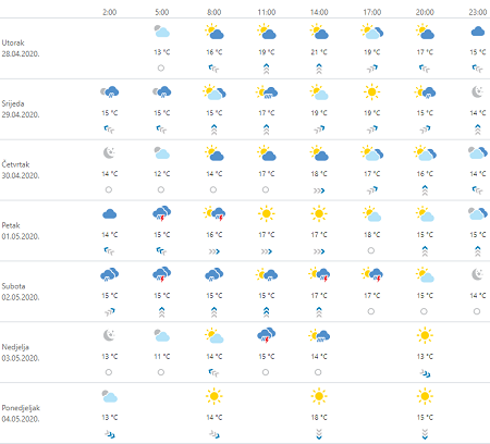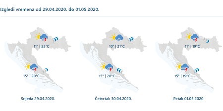 U srijedu promjenljivo oblačno mjestimice s kišom i vjetrovito. Lokalno će biti i pljuskova praćenih grmljavinom, većinom u Dalmaciji, dok je na sjevernom Jadranu moguća i obilnija oborina. Puhat će umjeren, u gorju i vrlo jak južni i jugozapadni vjetar, a na moru i jugo. Krajem dana u unutrašnjosti prolazno umjeren sjeverozapadnjak. Najniža jutarnja temperatura zraka od 9 do 13, na obali i otocima i malo viša, a najviša dnevna uglavnom između 18 i 23 °C.