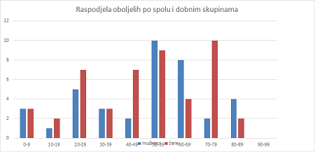 Od početka epidemije na našem području više je bilo zaraženih žena nego muškaraca. Prema dobnoj skupini najviše je oboljelih bilo između 50 i 59 godina, a najmanje između 10 i 19 godina. Gledajući po spolu, najviše oboljelih žena bilo je u dobnoj skupini od 70-79, a muškaraca u skupini od 50-59 godina.