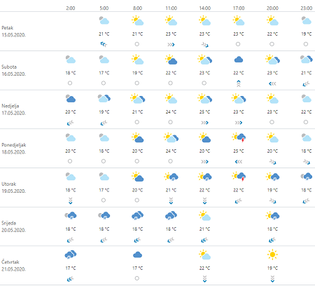Djelomice sunčano s promjenljivom naoblakom, a povremeno može pasti malo kiše ili poneki pljusak. Oborina će biti češća na kopnu, a može je biti i na sjevernom Jadranu, u ponedjeljak u Dalmaciji. Vjetar većinom slab sjeveroistočni. Na sjevernom Jadranu puhat će umjerena do jaka bura, u Dalmaciji u početku umjereno jugo, od nedjelje sjeverozapadnjak. Temperatura bez znatnije promjene. U subotu na kopnu danju svježije.