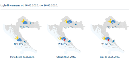 U ponedjeljak djelomice sunčano, a poneki lokalni je pljusak moguć ponajprije u gorskim predjelima. Zatim promjenljivo uz kišu i pljuskove s grmljavinom, u utorak češće u unutrašnjosti i na sjevernom Jadranu, a u srijedu u Dalmaciji. Puhat će povremeno umjeren sjeveroistočni i sjeverni, u ponedjeljak prolazno istočni vjetar, a na Jadranu sjeverozapadnjak i bura koja će osobito podno Velebita biti i jaka s olujnim udarima. I dalje toplo, ponegdje i vrlo toplo.