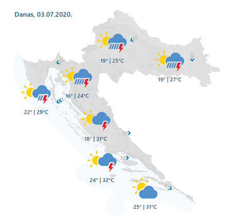 Danas umjereno i pretežno oblačno s povremenom kišom, često u obliku pljuskovima praćenih grmljavinom, lokalno izraženijih. Oborina će ponegdje biti obilna, ponajprije u zapadnim predjelima. Na srednjem i južnom Jadranu sunčanije i uglavnom suho. Zapuhat će umjeren do jak sjeverni i sjeveroistočni vjetar, na sjevernom Jadranu bura, podno Velebita s olujnim udarima, a u Dalmaciji umjeren zapadni i sjeverozapadni vjetar, prema večeri na sjevernom dijelu bura. Najviša dnevna temperatura zraka od 23 do 28, na Jadranu od 27 do 33 °C.