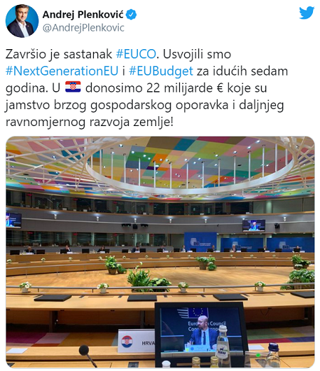 “Završio je sastanak #EUCO. Usvojili smo budžet za idućih sedam godina. I donosimo 22 milijarde € koje su jamstvo brzog gospodarskog oporavka i daljnjeg ravnomjernog razvoja zemlje!”