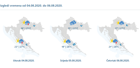 Danas postupno naoblačenje sa zapada, mjestimice s kišom i lokalnim pljuskovima s grmljavinom, osobito na sjevernom Jadranu i u gorju, pri čemu će pljuskovi biti češći i intenzivniji poslijepodne i navečer. Najviše sunčanog vremena bit će u Dalmaciji, no prema večeri poneki je pljusak moguć na sjevernom dijelu. Vjetar većinom slab, u Slavoniji povremeno umjeren jugoistočni. Na Jadranu će puhati umjereno i jako jugo. Najviša temperatura zraka između 25 i 30, u Dalmaciji do 35 °C.