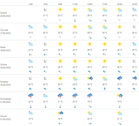 Prevladavat će sunčano, vjetar većinom slab s juga, danju ugodno toplo ili vruće. U unutrašnjosti ujutro osobito uz rijeke može biti magle. Uz dnevni razvoj oblaka u gorju i u unutrašnjosti Istre moguć je neki kraći popodnevni pljusak, osobito četvrtak i petak. u subotu jako jugo kao nagovještaj promjene vremena koja bi sjeverni Jadran mogla zahvatiti potkraj dana, a na kopnu južina s kojom će dnevna temperatura prolazno ali osjetno porasti.