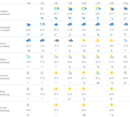 UPOZORENJE METEOALARMA: Danas jako jugo. Najjači udari vjetra > 65 km/h. BUDITE NA OPREZU zbog krhotina koje lete nošene jakim vjetrom. Mogući su lokalizirani prekidi u aktivnostima na otvorenom. Toplinski val. Minimalna temperatura > 25 °C. U ponedjeljak jaki i olujni udari SZ vjetra. Najjači udari vjetra > 65 km/h. Obilna kiša. Količina oborine > 40 mm. Lokalno izraženiji pljuskovi s grmljavinom te moguće nevere praćene tučom i olujnim udarima vjetra. Količina oborine > 20 mm; Vjerojatnost grmljavine > 60 %