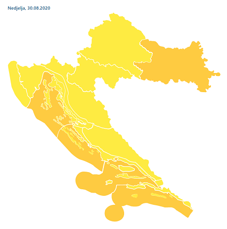Danas u većini krajeva pretežno sunčano i vruće. Na zapadu nestabilno uz lokalno izraženije pljuskove i grmljavinu, ponajprije na sjevernom Jadranu, i to u osobito u Istri, te u Gorskome kotaru. Puhat će umjeren južni i jugozapadni vjetar, u gorju i jak, a na Jadranu jako do olujno jugo, na sjevernom dijelu popodne u okretanju na jak jugozapadnjak. Najviša dnevna temperatura zraka uglavnom od 29 do 34, a u Slavoniji, Baranji i Srijemu i do 37 °C.