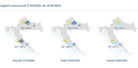 U četvrtak pretežno i djelomice sunčano, a uz promjenljivu naoblaku u drugome dijelu dana uglavnom na kopnu mjestimični pljuskovi s grmljavinom. Pljuskovi će biti češći i lokalno izraženiji u gorju te ponegdje u središnjim predjelima, a poneki se izolirani pljusak ne može se isključiti ni duž obale. Puhat će umjeren sjeverni i sjeveroistočni vjetar, na Jadranu bura i sjeverozapadnjak. U drugom dijelu dana vjetar će pojačati, a pod Velebitom će biti i olujnih udara bure. Najniža jutarnja temperatura od 12 do 17, na Jadranu od 20 do 23. Najviša dnevna od 25 do 30, na Jadranu mjestimice i malo viša.