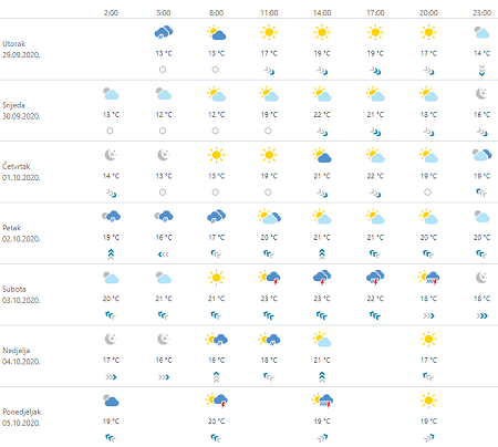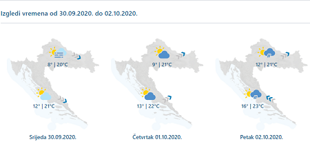 Danas u unutrašnjosti u prvom dijelu dana umjereno i pretežno oblačno, mjestimice uz malo kiše, a zatim postupno smanjenje naoblake. Na Jadranu djelomice, osobito poslijepodne i pretežno sunčano, no uz lokalno povećanu naoblaku malo kiše ili poneki pljusak, uglavnom u Dalmaciji. Vjetar slab i umjeren zapadni i sjeverozapadni, na jugu i istoku zemlje s jakim udarima. Najviša temperatura zraka između 16 i 20, na Jadranu 19 i 22 °C.