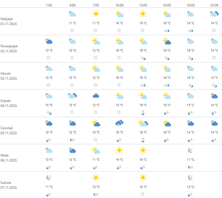 Djelomice, a na Jadranu i pretežno sunčano. U ponedjeljak i utorak magla ili niski oblaci bit će još češći i dugotrajniji, a može ih biti i na sjevernom i dijelu srednjeg Jadrana. U srijedu na kopnu oblačno, mjestimice uz slabu kišu, osobito u gorju. Vjetar uglavnom slab, u srijedu će na kopnu zapuhati slab do umjeren sjeveroistočnjak, a na sjevernom Jadranu bura koja će prema kraju dana jačati. I dalje će posvuda biti iznadprosječno toplo za ovaj dio godine.