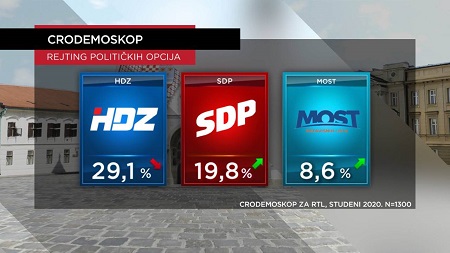 Vladajući HDZ (29,1 posto) ostaje prvi izbor, ali drugi mjesec zaredom bilježi blagi pad rejtinga, izgubili su jedan postotni bod u zadnjih mjesec dana – toliko je SDP (19,8 posto) s novim predsjednikom dobio – 29 posto HDZ, a gotovo 20 posto SDP! Za povratak na treću poziciju ovoga se mjeseca izborio MOST (8,6 posto) čiji rejting također raste.