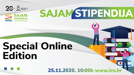 Prvi online Sajam stipendija i visokog obrazovanja održat će se na internetskom portalu www.iro.hr 25. studenoga 2020. od 10 do 16 sati u jednostavnom i prilagodljivom formatu sudjelovanja, i za izlagače i za posjetitelje. Na istoj će se stranici moći pronaći satnica te službeni i popratni program.