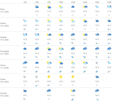 Do nedjelje u unutrašnjosti i dalje stabilno s maglom i niskom naoblakom te sa sunčanim razdobljima ponegdje sredinom dana i poslijepodne, posebno u nedjelju. Na moru djelomice, mjestimice i pretežno sunčano, no ponegdje može biti niskih oblaka i magle te poneke kapi kiše, posebno na sjevernom i dijelu srednjeg Jadrana i to prema otvorenom moru. U ponedjeljak jače naoblačenje s kišom, uglavnom u gorju te na sjevernom Jadranu moguće obilnijom. U subotu u gorju ponegdje umjeren jugozapadnjak koji će u nedjelju puhati i drugdje na kopnu. Na Jadranu će u nedjelju zapuhati jugo koje će jačati i u ponedjeljak mjestimice biti jako. U drugom dijelu ponedjeljka u unutrašnjosti će okrenuti na sjeverni vjetar. Najviša dnevna temperatura od nedjelje na kopnu u porastu, a na moru će jutro u ponedjeljak biti toplije nego u dane vikenda.