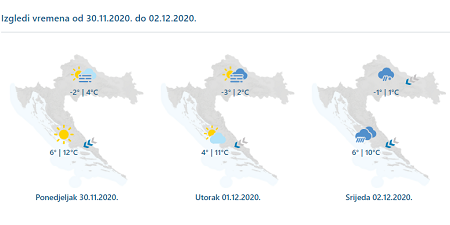 U prva dva dana barem djelomice sunčano, ujutro u unutrašnjosti uz mjestimičnu maglu koja se u utorak ponegdje može i dulje zadržati. U srijedu pretežno oblačno uz povremene oborine – na Jadranu kišu, ponegdje moguće i obilniju, u gorju snijeg, a u nizinama u početku oborine na granici kiše i snijega, a do kraja dana uglavnom snijeg. Vjetar u unutrašnjosti većinom slab, u srijedu umjeren do jak sjeveroistočni. Na Jadranu u ponedjeljak će još puhati umjerena do jaka, na udare i olujna bura koja će postupno slabjeti. U srijedu ponovno jačanje bure, uglavnom na sjevernom i srednjem dijelu, dok će na jugu još veći dio dana puhati jako jugo. Jutra hladnija nego proteklih dana, a dnevna temperatura prema sredini tjedna u padu.