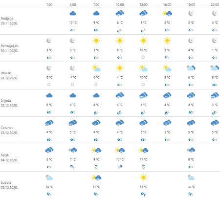 Jutros u većini krajeva oblačno, mjestimice uz slabu oborinu. Kiše će biti uglavnom u Dalmaciji, a u gorju susnježice i snijega, dok oborine na granici kiše i snijega može biti u Posavini. Zatim smanjenje naoblake najprije na sjevernom Jadranu i zapadu unutrašnjosti, navečer i drugdje. Zapuhat će slab do umjeren sjeveroistočni vjetar, u gorju ponegdje i jak, a uz obalu umjerena i jaka bura, na udare mjestimice i olujna. Najviša dnevna temperatura zraka od 1 do 5, na Jadranu i u unutrašnjosti Istre i Dalmacije između 10 i 14 °C.