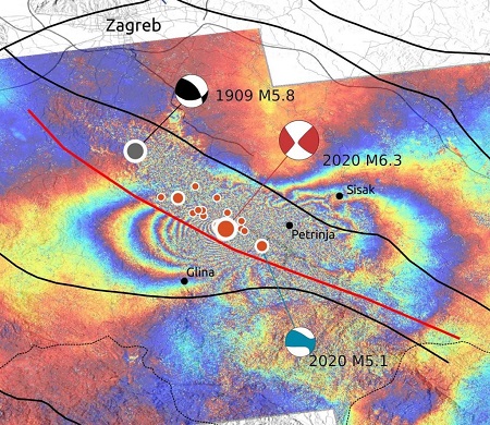 Takva jedna karta je i ona dr. Mladena Vihera s Hrvatskog vojnog učilišta, koja je ilustrirala, na temelju mjerenja satelita Sentinel-1, da je Petrinja u potresu 29.12.2020. propala za 12 i više centimetara, a da se područje s druge strane rasjeda podiglo za sedam i više centimetara.