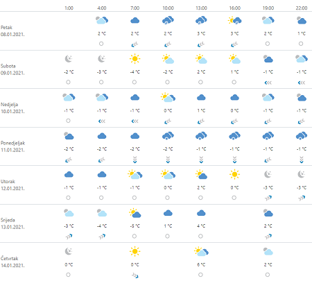 Danas će prevladavati oblačno, mjestimice s kišom, u gorju snijegom kojeg će do kraja dana ponegdje biti i u nizinama. Poslijepodne na sjevernom i dijelu srednjeg Jadrana smanjenje naoblake. Vjetar slab i umjeren sjeverni i sjeveroistočni. Na Jadranu bura, podno Velebita jaka, te sjeverozapadnjak. Najviša dnevna temperatura zraka između 0 i 5, na Jadranu od 8 do 13 °C.