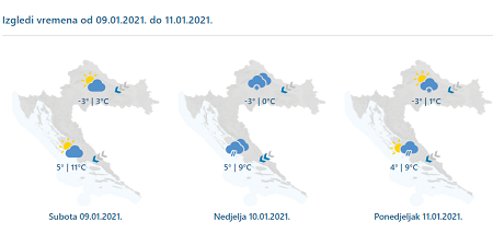 Umjereno, često i pretežno oblačno, u subotu uz malo snijega uglavnom u gorju. Zatim kiša na Jadranu koja u nedjelju na jugu lokalno može biti obilnija, a u unutrašnjosti većinom snijeg uz stvaranje mjestimice novog snježnog pokrivača. U unutrašnjosti lokalno moguća magla, osobito u subotu. Puhat će povremeno umjeren sjeveroistočni i sjeverni vjetar. Na Jadranu umjerena i jaka bura, u ponedjeljak u Dalmaciji i sjeverozapadnjak. Temperatura zraka u padu.