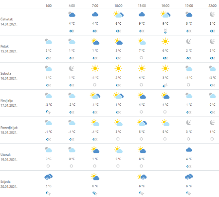 Danas umjereno do pretežno oblačno s povremenom oborinom. U unutrašnjosti mjestimice snijeg, osobito u prvom dijelu dana kad je u središnjim kopnenim predjelima moguća i slaba kiša koja se smrzava u dodiru s podlogom. U drugom dijelu dana oborina uglavnom u Dalmaciji, mjestimice malo kiše, ponegdje i snijeg, a na sjeveru zemlje postupno smanjenje naoblake i česta sunčana razdoblja. Na kopnu vjetar slab, na istoku i umjeren sjeverni i sjeverozapadni. Na Jadranu istočnjak i jugoistočnjak sredinom dana će okrenuti na buru i jačati na jaku s olujnim udarima. Najviša dnevna temperatura od 0 do 5 te između 6 i 10 °C na moru.