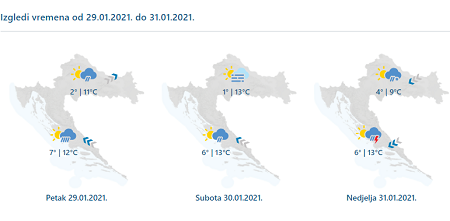 Danas prijepodne pretežno sunčano, od sredine dana uz postupno naoblačenje sa zapada. Ujutro u unutrašnjosti ponegdje magla, uglavnom po gorskim kotlinama. Navečer i u noći na petak mjestimice slaba kiša, a u gorju i unutrašnjosti Dalmacije susnježica i snijeg. Na kopnu vjetar u početku slab, popodne će zapuhati umjeren jugozapadnjak. Na Jadranu će slaba bura i sjeverozapadnjak popodne okrenuti na jugo i jačati. Najviša dnevna temperatura zraka od 4 do 9, na Jadranu između 7 i 12 °C.