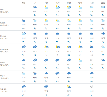 Iznadprosječno toplo te promjenljivo oblačno, a u subotu malo kiše na zapadu. Od nedjelje uz jače naoblačenje kiša i u ostalim predjelima, češća i lokalno obilna na Jadranu i uz njega, a u ponedjeljak u Dalmaciji izraženi pljuskovi s grmljavinom. Umjeren i jak jugozapadnjak, na Jadranu umjereno do jako, prolazno i olujno jugo, oslabjet će u ponedjeljak. Temperatura u ponedjeljak malo niža, osobito na kopnu.