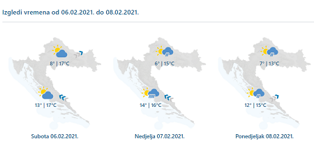 U subotu promjenljivo oblačno uz sunčana razdoblja, češća popodne. Uz više oblaka malo kiše može pasti na sjevernom Jadranu i u gorju, osobito širem riječkom području i u Gorskom kotaru. Puhat će umjeren, prolazno jak jugozapadni vjetar, u gorju s olujnim udarima, a na Jadranu jugo u jačanju. Temperatura i dalje osjetno viša od prosjeka, najniža jutarnja 5 do 10, na Jadranu od 11 do 14, a najviša dnevna od 14 do 19 °C.