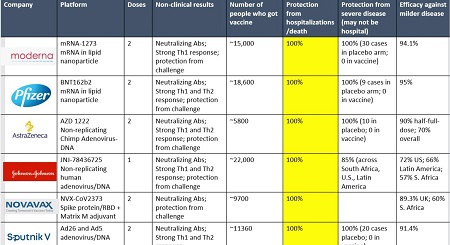 U tablici se navodi mehanizam djelovanja pojedinog cjepiva, u koliko se doza prima, broj ljudi na kojima je ispitano tijekom kliničkih ispitivanja, učinkovitost zaštite od hospitalizacije i smrti, učinkovitost zaštite od težeg oblika bolesti (ne mora zahtijevati hospitalizaciju) te učinkovitost protiv blažeg oblika bolesti.