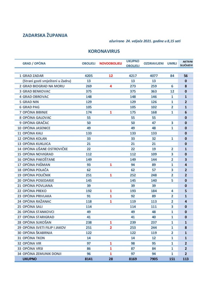 Novozaraženi izolaciju provode na područjima gradova Zadar (12) i Biograd (4) te općina Bibinje (1), Pašman (1), Poličnik (1), Preko (1), Privlaka (1), Ražanac (1), Sukošan (1), Sv. Filip i Jakov (2), Vir (1), Vrsi (1), Zemunik (1).