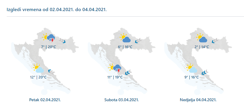 U petak na Jadranu pretežno sunčano, u unutrašnjosti uz promjenljivu naoblaku mjestimice kiša ili lokalni pljuskovi s grmljavinom. Krajem dana porast naoblake s češćom kišom koja će do subote ujutro u većini predjela unutrašnjosti prestati, no danju će biti češća na Jadranu, osobito u Dalmaciji, pri čemu su mogući i pljuskovi s grmljavinom. Zapuhat će umjeren sjeverozapadni i sjeveroistočni vjetar, u petak na Jadranu jugo, a zatim jaka bura, lokalno s olujnim udarima. U nedjelju sunčanije, ali osjetno hladnije, ponajprije na kopnu.