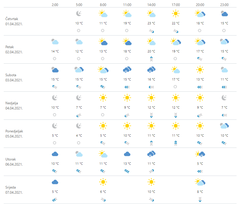 U petak u unutrašnjosti promjenljivo oblačno sa sunčanim razdobljima, mjestimice uz malo kiše ili poneki pljusak s grmljavinom. Navečer i u noći porast naoblake uz češću kišu. Na Jadranu pretežno sunčano, povremeno uz više oblaka. Zapuhat će umjeren sjeveroistočni, na istoku sjeverozapadni vjetar, poslijepodne u slabljenju. Na Jadranu slabo do umjereno jugo i južni vjetar. Najniža temperatura zraka od 4 do 9, na Jadranu od 9 do 14, a najviša između 17 i 21 °C.