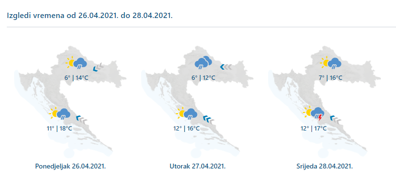 Promjenljivo, u utorak na kopnu i pretežno oblačno povremeno s kišom, a na Jadranu i pljuskovima s grmljavinom. Vjetar slab do umjeren istočni i jugoistočni, na Jadranu umjereno, u utorak i jako jugo, a na sjevernom dijelu bura. Bit će svježije, osobito na kopnu.