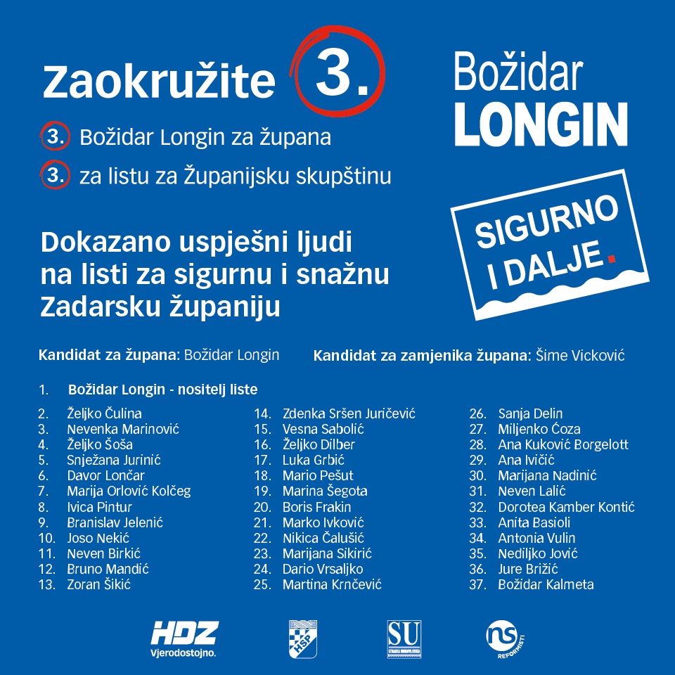 – Pred nama je jedno važno razdoblje u kojem možemo napraviti velike stvari za Zadarsku županiju. Trenutno se kod nas provode projekti vrijedni gotovo 3,5 milijarde kuna i to je rezultat kvalitetnog rada našeg tima, ali i snažne suradnje s državom gdje imamo 5 zadarskih državnih tajnika. Stoga, nije vrijeme za eksperimente, birajmo sigurnost, birajmo razvoj. Jedini smo ponudili ozbiljan i temeljit program ravnomjernog razvoja Zadarske županije u narednom razdoblju i vjerujem da će naši sugrađani i ovog puta to prepoznati. Važna je pobjeda na izborima za župana, ali je jednako tako važna stabilna skupština, stoga podržite i listu naše koalicije HDZ-HSP-Stranka umirovljenika-Reformisti. Kandidati s naše liste dokazani su, ugledni i uspješni ljudi koji dolaze iz svih krajeva Zadarske županije. Od prvog do mene, ravnatelja Opće bolnice Željka Čuline do posljednjeg na listi, Božidara Kalmete, koji je i na ovaj simboličan način odlučio dati svoj doprinos našoj pobjedi. Zaokružite 3 za župana i 3 za našu listu i nastavimo zajedno graditi sigurnu i snažnu Zadarsku županiju!