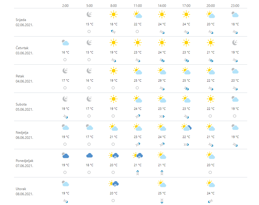 Danas sunčano uz malu, u unutrašnjosti ponegdje i umjerenu naoblaku, osobito na istoku. Ujutro uz rijeke i po kotlinama lokalna kratkotrajna magla. Vjetar većinom slab, na moru ujutro burin, a od sredine dana mjestimice i umjeren zapadnjak i jugozapadnjak. Najviša dnevna temperatura uglavnom između 21 i 26 °C.
