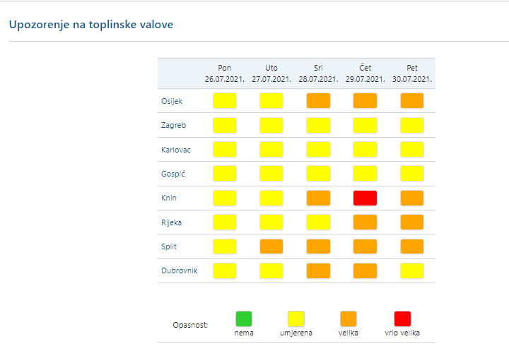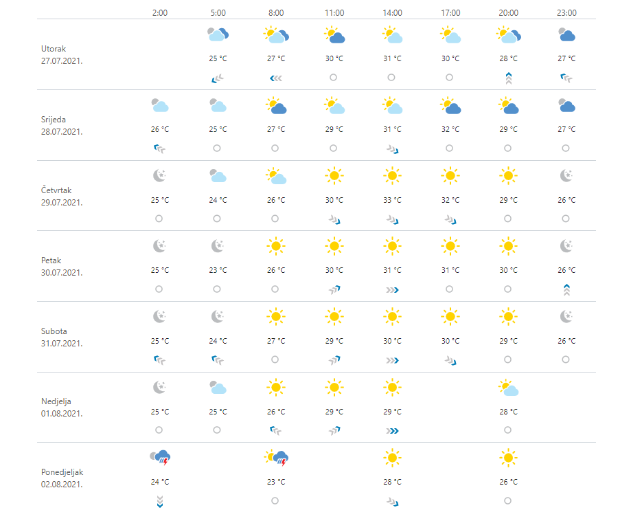 U srijedu pretežno sunčano, povremeno s umjerenom naoblakom te i dalje vruće i vrlo vruće. Vjetar slab i mjestimice umjeren jugozapadni i južni, na Jadranu i zapadni. Najniža temperatura zraka od 16 do 21, na Jadranu od 22 do 26, a najviša većinom između 32 i 37 °C.