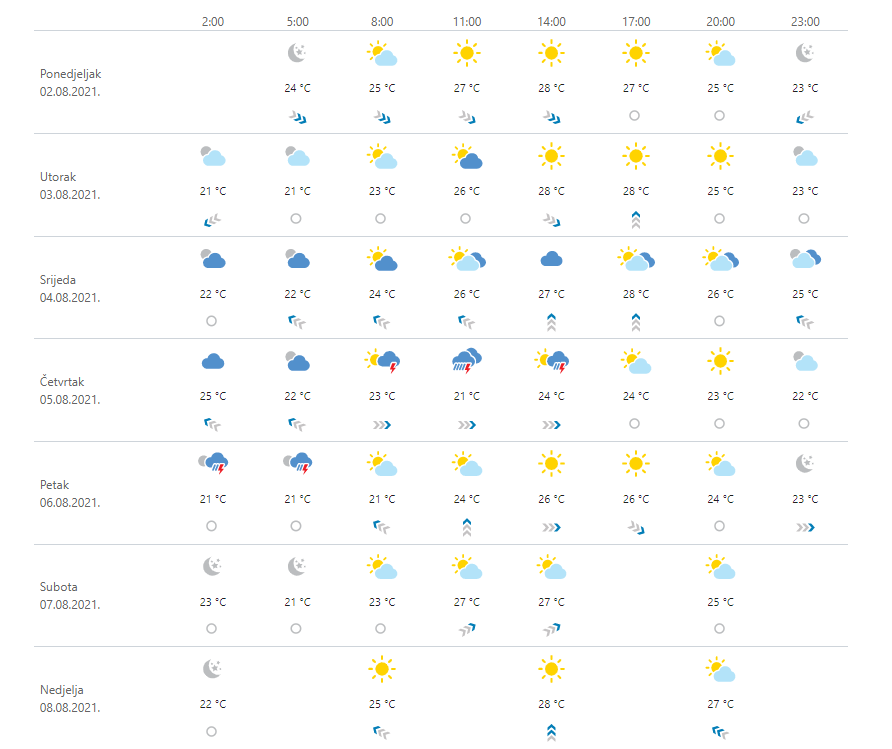 U većini krajeva djelomice sunčano, a uz promjenljivu naoblaku ponegdje će biti kiše ili pljuskova s grmljavinom, osobito na sjevernom Jadranu i u gorju. U četvrtak oblačnije s češćom kišom i pljuskovima s grmljavinom. Vjetar slab i umjeren jugozapadni, na Jadranu i sjeverozapadni, a u srijedu prolazno i jugo. Bit će toplo i vrlo toplo, u Dalmaciji i vruće.