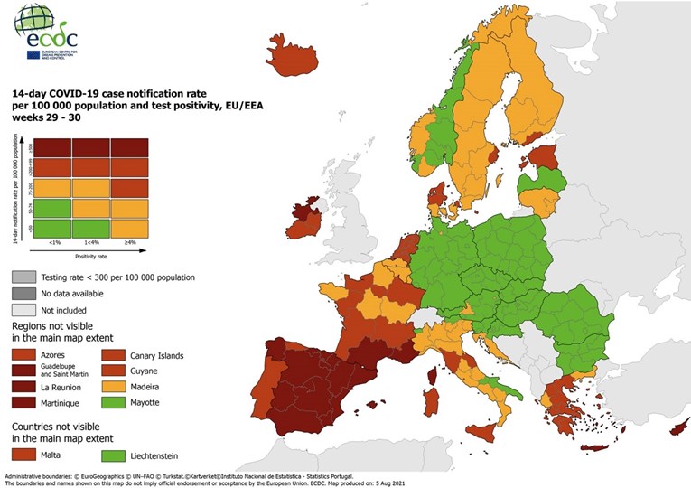 Epidemiološka karta ECDC-a za Europu objavljuje se svaki tjedan na temelju 14-dnevne incidencije i udjela pozitivnih testova u ukupnom broju testiranih.