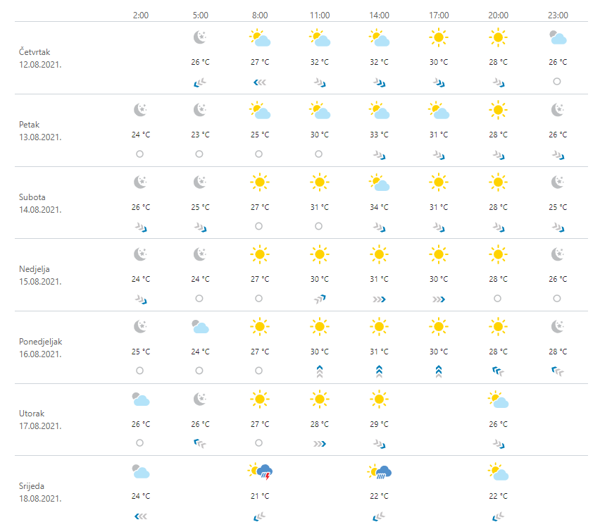 Prevladavat će sunčano i vruće, na Jadranu uz tople i vrlo tople noći i jutra. Uz jači dnevni razvoj oblaka u unutrašnjosti postoji vjerojatnost za poneki poslijepodnevni pljusak, posebice u nedjelju. Vjetar većinom slab, na Jadranu ponegdje umjeren sjeverozapadni, uz obalu i jugozapadni.