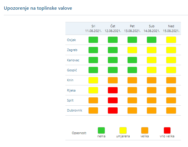 Danas sunčano i vruće, u unutrašnjosti uz malu, prijepodne na sjeveru i umjerenu naoblaku. U gorju vrlo mala vjerojatnost za lokalni popodnevni pljusak. Vjetar na kopnu većinom slab. Na Jadranu ujutro slaba i umjerena bura, podno Velebita s jakim udarima, a od sredine dana zapuhat će sjeverozapadni vjetar, uz obalu i jugozapadni. Najviša dnevna temperatura zraka uglavnom između 31 i 36 °C.