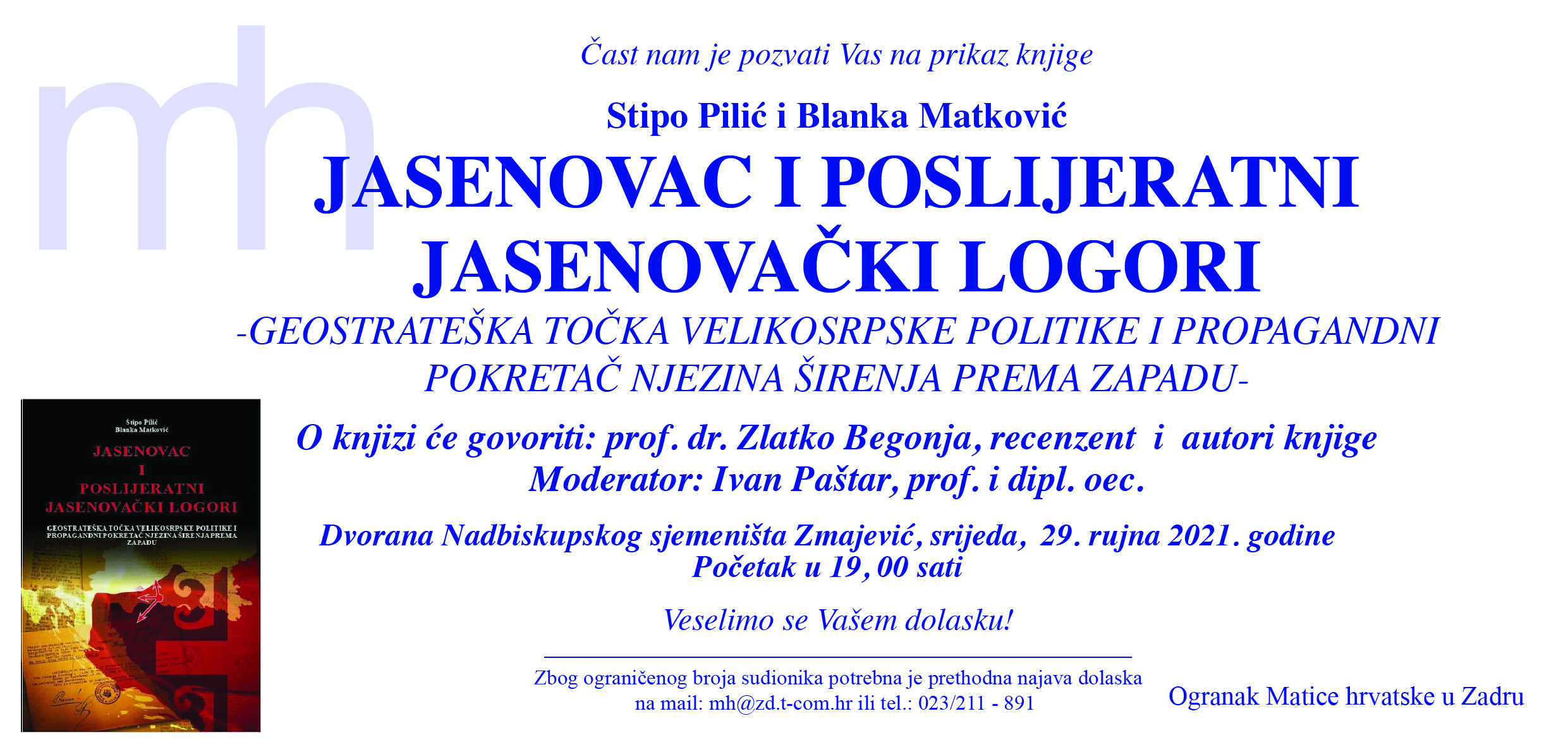 Ogranak Matice hrvatske u Zadru prikazuje knjigu Stipe Pilića i Blanke Matković: „Jasenovac i poslijeratni jasenovački logori – Geostrateška točka velikosrpske politike i propagandni pokretač njezina širenja prema zapadu“.