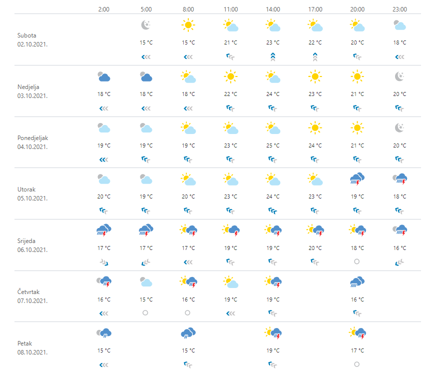 U većini krajeva danas pretežno sunčano, mjestimice s umjerenom naoblakom. U prvom dijelu dana uglavnom u središnjim i gorskim krajevima lokalno magla ili niski oblaci. Vjetar većinom slab, na istoku zemlje povremeno umjeren jugoistočni, a ponegdje uz obalu jugozapadni. Najviša dnevna temperatura zraka od 18 do 22, na Jadranu između 23 i 27 °C.
