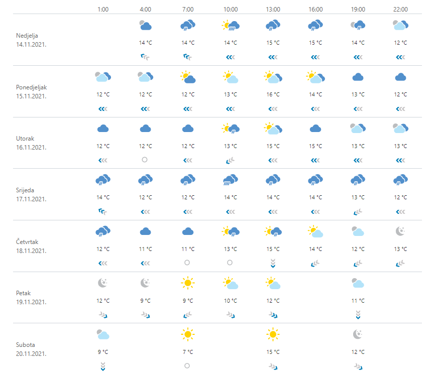 Promjenljivo i pretežno oblačno, od utorka sve češće kiša ili pljuskovi s grmljavinom, uglavnom na Jadranu i uz njega. U ponedjeljak većinom bez oborine, a kraća sunčana razdoblja moguća su i u unutrašnjosti. Vjetar slab do umjeren sjeveroistočni i sjeverni, u Slavoniji istočni. Umjerena i jaka bura, pod Velebitom s olujnim udarima u utorak će slabjeti, a u Dalmaciji okrenuti na jugo te jačati. Temperatura se neće znatnije mijenjati.