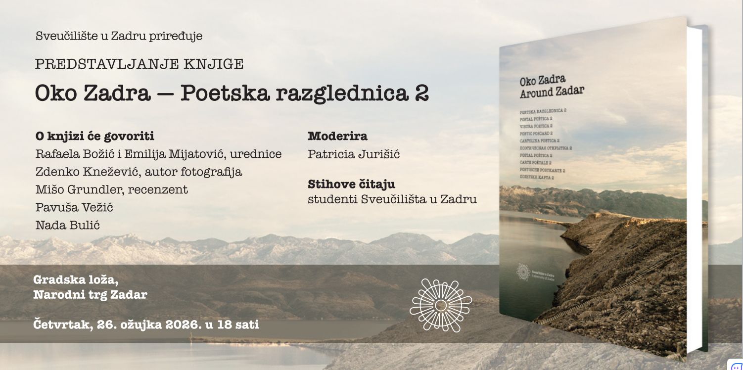 Sveučilište u Zadru priređuje predstavljanje knjige „Oko Zadra — Poetska razglednica 2″, koje će se održati u četvrtak 26. ožujka s početkom u 18 sati u Gradskoj loži (Narodni trg, Zadar).
