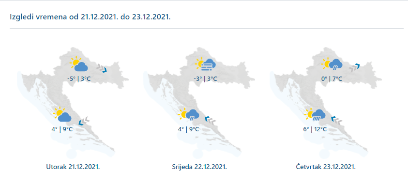 U unutrašnjosti u utorak djelomice sunčano uz promjenljivu naoblaku. Zatim umjereno do pretežno oblačno, ujutro uz lokalnu maglu. U gorju će u srijedu biti malo susnježice ili snijega, a u četvrtak kiše. U utorak još umjeren sjeverozapadni vjetar u Slavoniji, a u četvrtak će zapuhati jugozapadnjak. Jutra hladna uz umjeren mraz, a danju prohladno. Od četvrtka porast temperature zraka. Na Jadranu u utorak djelomice sunčano. Zatim pretežno oblačno. U srijedu mjestimice kiša na sjevernom dijelu, a u četvrtak posvuda kiša, ponegdje i izraženija. U utorak umjerena do jaka bura će slabjeti te najprije na sjevernom dijelu okretati na jugo. U četvrtak jugo u jačanju. Jutra poprilično svježa, čak i prohladna, a i danju razmjerno svježe. Tek od četvrtka toplije.